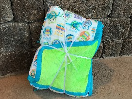Spring colored blue and lime green hand tied baby quilt with satin binding. Cotton owl patterned fabric front with plush lime green minky style back.