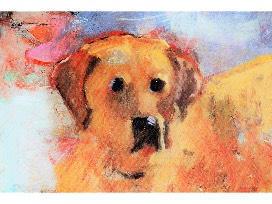 Framed oil on canvas. Bring home this stunning painting and you will have a faithful friend to greet you every day. Warm strokes of gold and red against vivid cool tones will create a sunny mood even on the darkest days and nights.