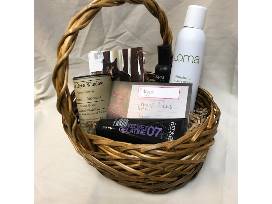 Basket with Lemon Grass candle from The Olde Open Window and hair care products from Foxden Salon. Including Redkin Velvet Gelatine 07 Blow-Dry Gel, Redkin Thickening Lotion 06, and Loma Finishing Hairspray. Basket also includes a $50 Gift Certificate to the Foxden Salon in Brainerd.
