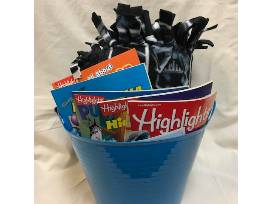 Basket includes various magazines for kids ages 6-12 plus a 1-year subscription to a magazine of your choice - Highlights Hello, High Five, or Highlights a. This is a great way to get your kids interested in reading and learning. Donated by Steve & Marilyn Holmvig