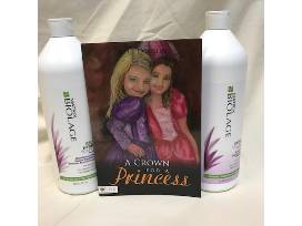 Basket with 33.8 oz Matrix Biolage Shampoo and Conditioner and a copy of Alice Conklin's book A Crown For a Princess.
