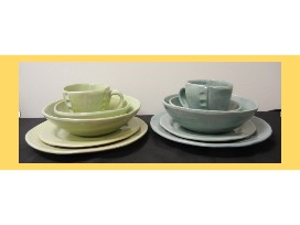 Original ceramic table setting for four from r.wood studio. This handcrafted set includes 4 salad dinner plates, 4 salad/soup bowls, 4 small plates, and 4 mugs. Generously donated by Past Basket, this item is valued at $936.