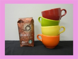4 colorful Waechtersbach latte mugs and 1 pound Starbucks' Breakfast Blend coffee. Invite your friends! Valued at $40