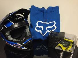 Package includes one Legacy Foxhead Pullover Hoody (Men's size M), Rx4 LG Blue Strike Helmet (size L), and a pair of Radius Moto Goggles.