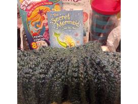 A basket filled with Mermaid goodies! My fairy doorway, stencils, travel mug, mermaid book, bath bomb and a handmade crocheted Mermaid blanket.