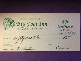 $50 Gift Certificate to the Big Foot Inn, and a bottle of 2016 The Seeker Rose.