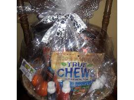 Gift Certificate to Fur Elegance for dog grooming and a Wonderful basket full of your doggies needs and wants! Bag of FROMM family Pet food, dog treats, 2 dog chew toys. Small bottles for doggie pampering. Sparkle black and silver collar and leash for a small to medium dog.