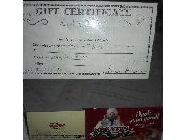 Bravo Pizza Gift certificate, Angelo's Large 1 topping pizza, Rosati's, & Nayeli's Gift Certificate.