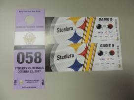 Value $790 Enjoy the game with two tickets to watch the Pittsburgh Steelers vs. Cincinnati Bengals on October 22, 2017 at 1:00pm. Gate C, Section 235, Row B, Seats 1 and 2. Also included is a parking pass to park in the Carnegie Science Center lot. Grab a bite before or after the game at Bettis Grill with $50 in gift cards. Also included is a complimentary night at Hyatt Place on the North Shore.