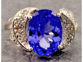991Perry's Fine & Estate Jewelry presents this estate 14K White Gold Designer Style Tanzanite and Diamond Ring - One Oval Tanzanite weighs approximately 4.53 karats and diamonds weigh approximately 0.26 karat total.