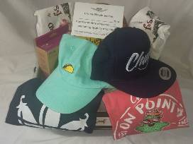 Packaged in a gray "woof" basket, this basket is filled with a gift certificate for dinner for two at Chuy's and a variety of Chuy's swag, including three koozies, a margarita shaker, 1 navy hat with Chuy's name, 1 teal hat with embroidered taco, 1 navy XL Chuy's shirt, 1 pink M Chuy's shirt, 1 black S Chuy's shirt, and 1 black XL Chuy's shirt. You will also enjoy a dog treat jar (white metal with wood lid and silver paw print plate) and 120 lavender-scented EARTHRATED (TM) dog waste bags.