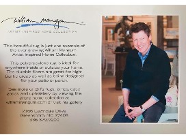 About the Artist: William Mangum's wildly successful 40-year career as an artist, designer, publisher, gallery owner and keynote speaker has taken him much farther than he could have ever imagined as a student at UNC-Greensboro, where he picked up watercolors for the first time. Since then, he has created over 3000 works of art focused on the natural beauty and cultural tradition of his beloved North Carolina. His colorful landscape and architectural paintings attract devoted collectors from both the private and corporate worlds, as well as shows and recognition from around the globe. Through various licensing agreements, his work has been used to create a variety of attractive gift items, bringing his work into even more homes and locales. Bill has also partnered with a number of corporate clients to enhance their brand with his uniquely Southern visual aesthetic. Working in his spacious Greensboro studio, he is appreciative of his good fortune and grateful for the opportunities it has afforded him. For years Bill has supported local charitable organizations and outreach programs benefiting the needy; to date, his popular holiday Honor Card project has raised $6.5 million on behalf of the homeless and indigent in the Tar Heel State.