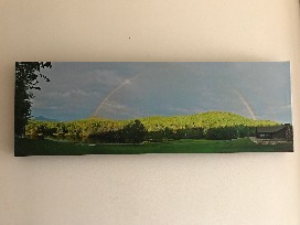 A 35 inch wide x 12 inch tall panoramic photograph printed on canvas and wrapped on a frame. It's of a double rainbow in the NC mountains taken at Eseeola Lodge in Linville, NC.