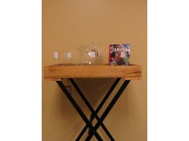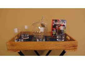 For those casual times on your deck or patio: a wooden tray with stand, linen napkins, 4 glasses, a pitcher and a sangria recipe book.