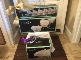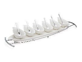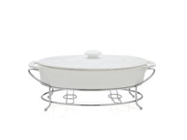 This Natura Collection combines elegant porcelain with chrome silver racks ensuring your table is pretty and protected. The handles make transporting meals easy and safe and the tea lights keep food warm. This Classic White Serving set bundle, made by Godinger, includes one 4-piece relish server, one 14- piece tasting set, and one covered baker-- oval in shape with a 2-quart capacity.