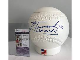 Large plastic replica Softball with removable lid autographed by Softball Pitcher Lisa Fernandez (1996 USA Olympic Gold). Certified by James Spence Authentication.