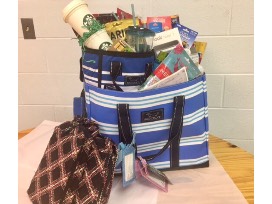 This basket includes $200 gift card for hotels.com, a $5 Starbucks gift card, Starbucks travel cups, a $50 Visa Fuel gift card, a $50 Speedway gift card, a $50 Maria's ristorante gift card, a 7 inch Nook, large tote, picnic cooler, travel pillows, Vera Bradley hanging organizer and cosmetic bag, fruit infused tumbler, crossword puzzle book, puzzles, luggage tags, travel lock, and more!
