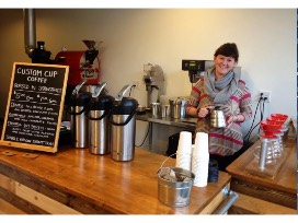 Two 12 oz bags freshly roasted coffee beans, mug, and sticker from Custom Cup Roastery, 321 E Monroe.