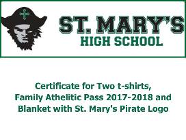 Certificate for two t-shirts, Family athletic pass 2017-2018; and Blanket with St. Mary's Logo