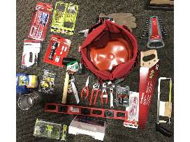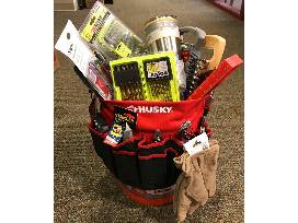 200 piece first-aid kit, Stanley tape measure, husky 165 lumen flashlight, husky combination wrench set, husky 150z lite steel rip, husky 23 pc stubby driver set, husky bucket jockey, husky 20" saw, husky 6pc screwdriver, Ryobi 21pc titanium coated drill bit, Ryobi 22pc driving kit, 5 gal home depot bucket, leather gloves, eyewear, blue hawk 10 in hacksaw, staple, Stanley 3-blade utility knife, 6-in long nose plyers, 6-in slip joint, 8-in groove joint, 8-in adj wrench, rayovac 6v float lantern, 106-pc drill/drive