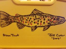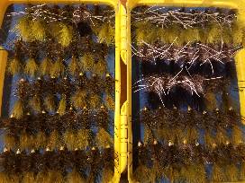 A fully loaded cliff box featuring a Jeff Currier Brown Trout drawing with 6 dozen professionally tied streamers.