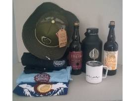 This gift basket from Odell Brewing comes complete with 2 t-shirts, 1 sweat shirt, 1 River Hat, 1 journal, 1 camp cup with sealed lid, 1 750 ml insulated aluminum jug. 1 750 ml bottle of Dark Theory (black cherry sour), and 1 750 ml bottle of Pina Agria (sour pineapple).