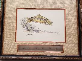 Rene Harrop Pen and Ink-Hand tinted in watercolor color Remarque. Leaping Trout "Brown" with 6 shadow box flies. Limited Edition number 78/150. This piece is 22.5" x 18.5"