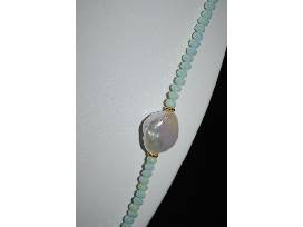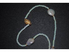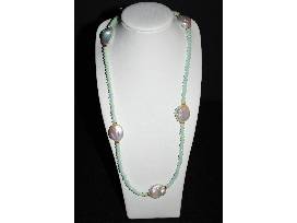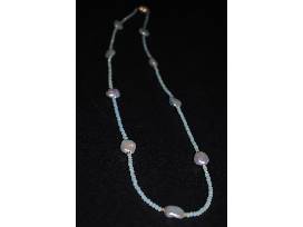 Long fine aqua and pearl strand necklace with beaded gold clasp.