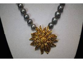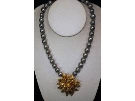 Necklace comprised of a vintage brooch on a strand of fresh water grey pearls with a vermeil clasp.
