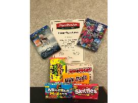 Two family size pizzas, thick and cheesy bread, S'Mores dessert pizza, container of cookie dough, two liters of soda, two movies (Sully and Trolls), and 5 boxes of candy.