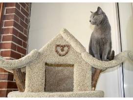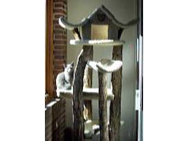 Luxury, super-sized cat tree with beige carpeted perches crafted on sturdy and solid wood with spectacular pagoda hideout on top. For your favorite feline. Approx. 76" high and 36" across. Over 50 lb. Arrangements to pick up are required.