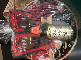 A beautiful Gift basket from Akai Hana with Saki and Saki set including $40 Gift Certificate
