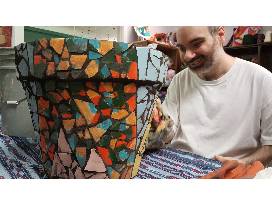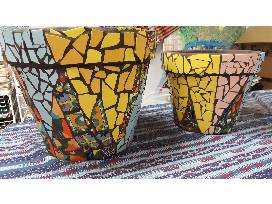 This handsome pair of graphic and colorful earthenware planters was tiled by artisans at Envision's Lewandowski Center. They feature a blend of Mexican Talavera tile, mixed with other re-purposed tiles that came to Envision through its partnership with Zero Landfill. These planters are suitable for outdoor use but are not frost proof and should be brought indoors for winter in Chicago. The planters measure approximately 18 and 16 inches in circumference, respectively.