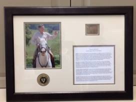 This 16"x22" framed and numbered print shows Ronald Reagan on horseback at Rancho del Ceilo ("Ranch in the Heavens"). The print is number 764 of 1130 and also includes a medallion featuring The Seal of the President of the United States of America and soil from the Ranch.