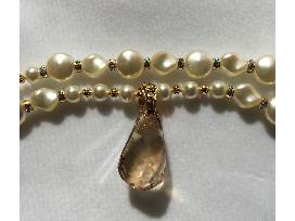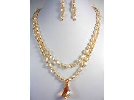 10The Creme Anglaise necklace and earring set is the ultimate statement of luxury. Crystal Swarovski pearls are both glamorous and refined. The smooth, lustrous color of the pearls are timeless and yet contemporary. The double strand necklace with shining Swarovski crystal rondelles are matched with an exquisite Swarovski Golden Shadow Helix pendant. Matching earrings complete this elegant set.