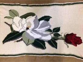 Inspired by the Magnolia and Rose print by Bob Dixon, this one-of-a-kind Magnolia and Rose Afghan measures approximately 66" L X 42" W. Designed and crocheted by KA's Director of Financial Operations, Brianne Tillotson, she is showing us her many talents with this beautiful afghan that any KA would be proud to own. Machine wash cold water, tumble dry on low heat.