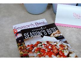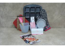 Includes a Brownie Pan, 2 Season's Best cookbooks, oven mitt, hot pad and "Help Whip Cancer" products: pink "Seasoned with Love" spatula, cake tester and scraper.