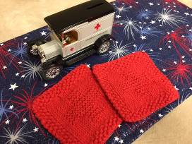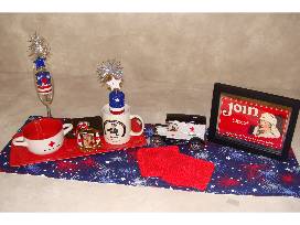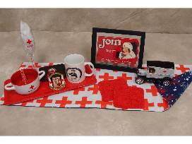 Reversible table runner, Ertl model of 1917 Red Cross Ambulance, reproduction of WWI Red Cross poster, mug with newsboy poster, ceramic soup bowl with handles, Spirit of America ornament, champagne flute, first aid kit, Melamine tray and hand knitted coasters.