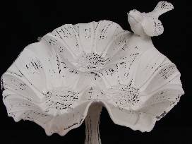 Distressed white wrought iron pedestal bird feeder or bath. Measures 13" tall.