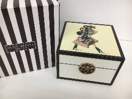 For your precious and petite pieces of luxury jewelry, you'll love the Shopper Girl Small Jewelry Box. This designer item and gift idea is crafted with a lacquered wood veneer exterior featuring a custom Izak illustration and an elegant lock and key closure.