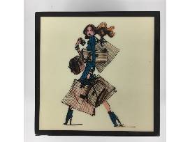 This great Shopper Girl jewelry box lacquered wood veneer exterior, custom Izak illustration, ultrasuede interior, two tier, multi-compartment jewelry box, lock and key closure, hinged lid, dimensions: 3.25"H X 5"W X 5"D