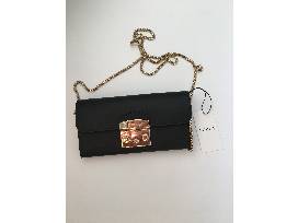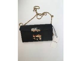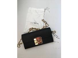 OMG. A Furla black-leather purse with a lovely gold shoulder chain. Absolutely sumptuous and definitely on-trend. Size: 8" long, 4" high, opens to 3.5 inches, two main pockets and a zippered middle pocket.