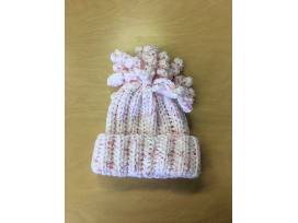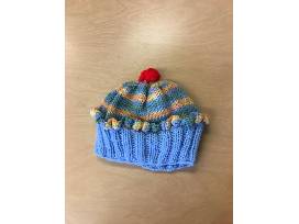 To go along with this cutie toy train are two hand-knitted child hats in two colors--a multi-blue-colored hat and a pink-colored hat with a tassle. Much love went into making these caps.