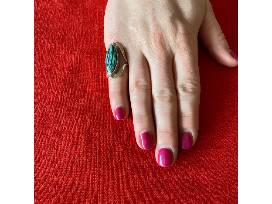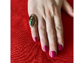 This ring is made of sterling silver. The ring has the unique feature of two different colored stones on the ring. The center of the ring rotates to display two different colored stones. The first stone is a black stone with several colors running through it. The second side has many shades of green. The size of the ring is small. Will fit most adult pinkies.