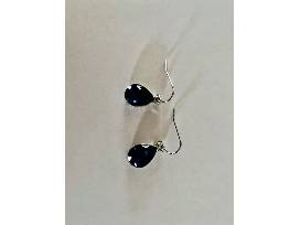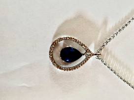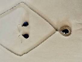 This lovely jewelry set consists of tear-drop blue earrings and a chain necklace also with the same design surrounded by a silver ring. The color is a sapphire blue. It is made by Monet.