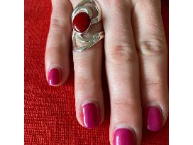 This is a sterling silver ring with decorated silver around a beautiful red stone. It is medium in size and will fit the ring finger of most adult women. What fun it will be to wear this ring.