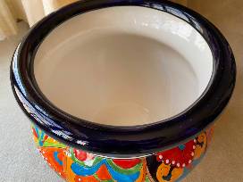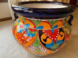 This colorful Mexican designed pot will brighten both your indoors and outdoors. It can be used for planting flowers or for a handy storage place for magazines or other household items.