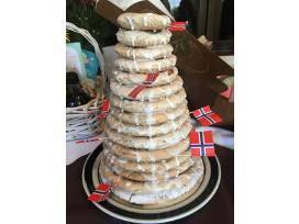 Kransekake, or "Ring Cake," is the signature cake of Norway, earning pride-of-place on wedding, birthday, graduation, reunions and holiday banquet tables. Traditionally made from almonds, confectioners sugar, and egg whites, it is a splendid flourless, gluten-free alternative to standard celebratory cakes. It is decorated with flags, flowers, or candies, depending upon the celebration. Served by breaking off pieces.