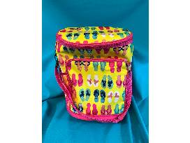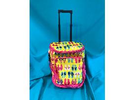 Pink and yellow with flip flop pattern, wheels and extending handle. Great for beach or pool.