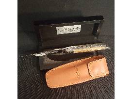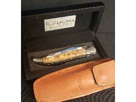Be the owner of this authentic Laguiole en Aubrac handmade 12cm polished stainless steel folding knife and bolsters, double wall with forged spring and "Belier" Ram Crust (Horn) handle. Includes a brown leather sheath.